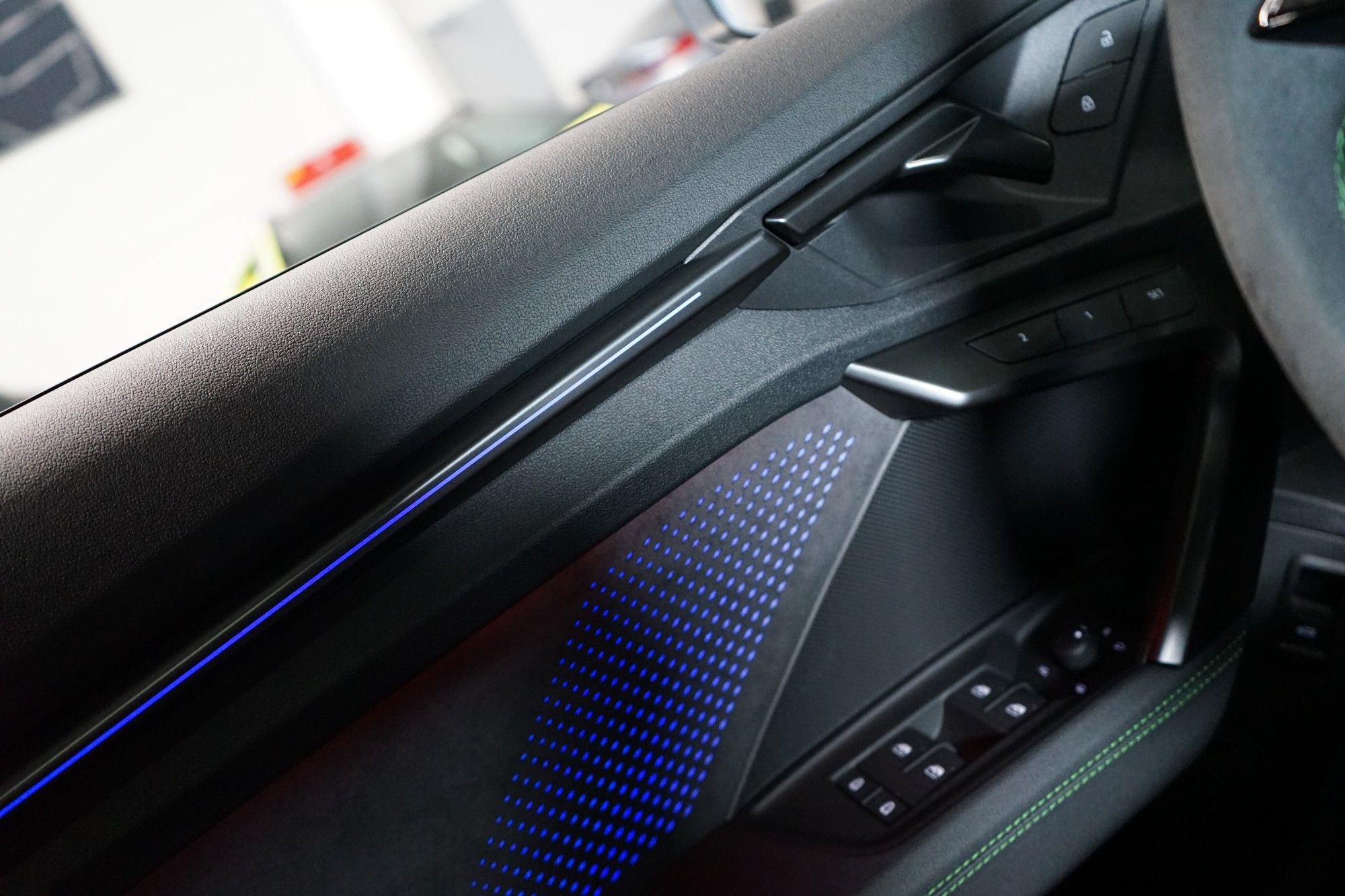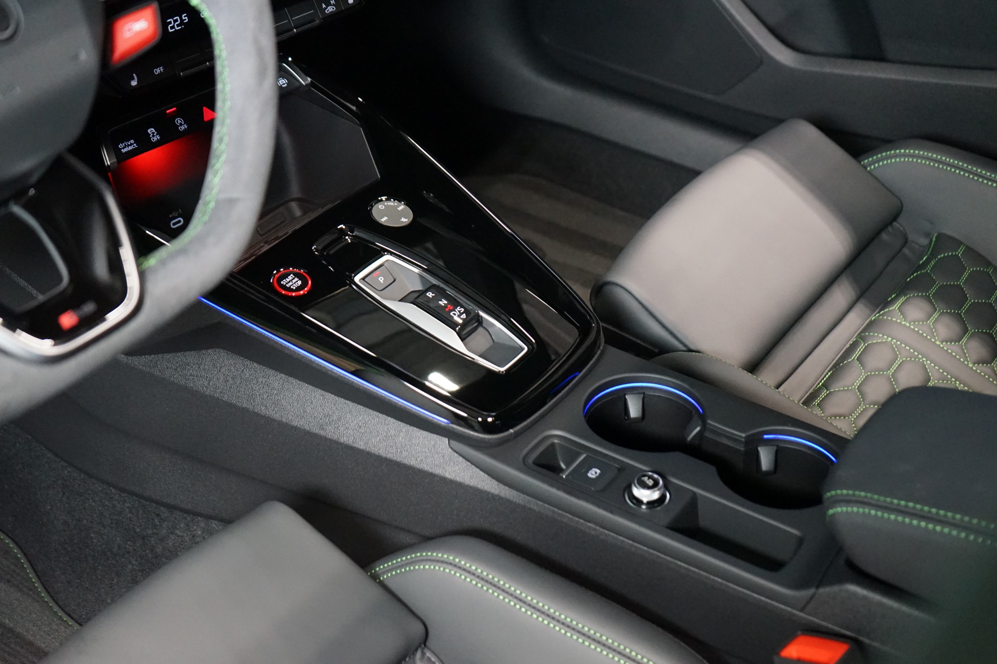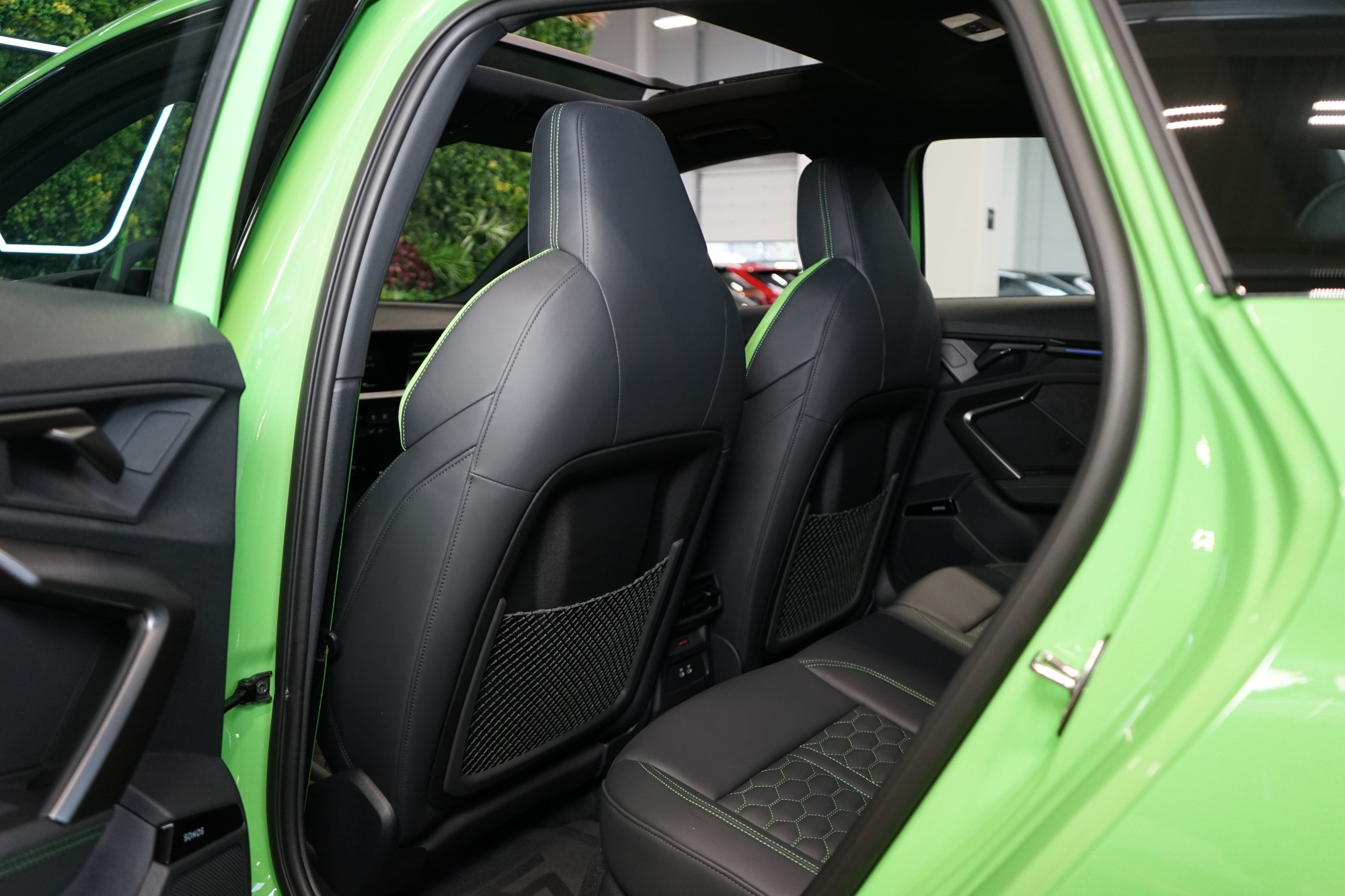 Sportovní sedadla vpředu v jemné kůži Nappa s kontrastním prošíváním v expresní zelené barvě se vzorem včelí plástve a reliéfem RS