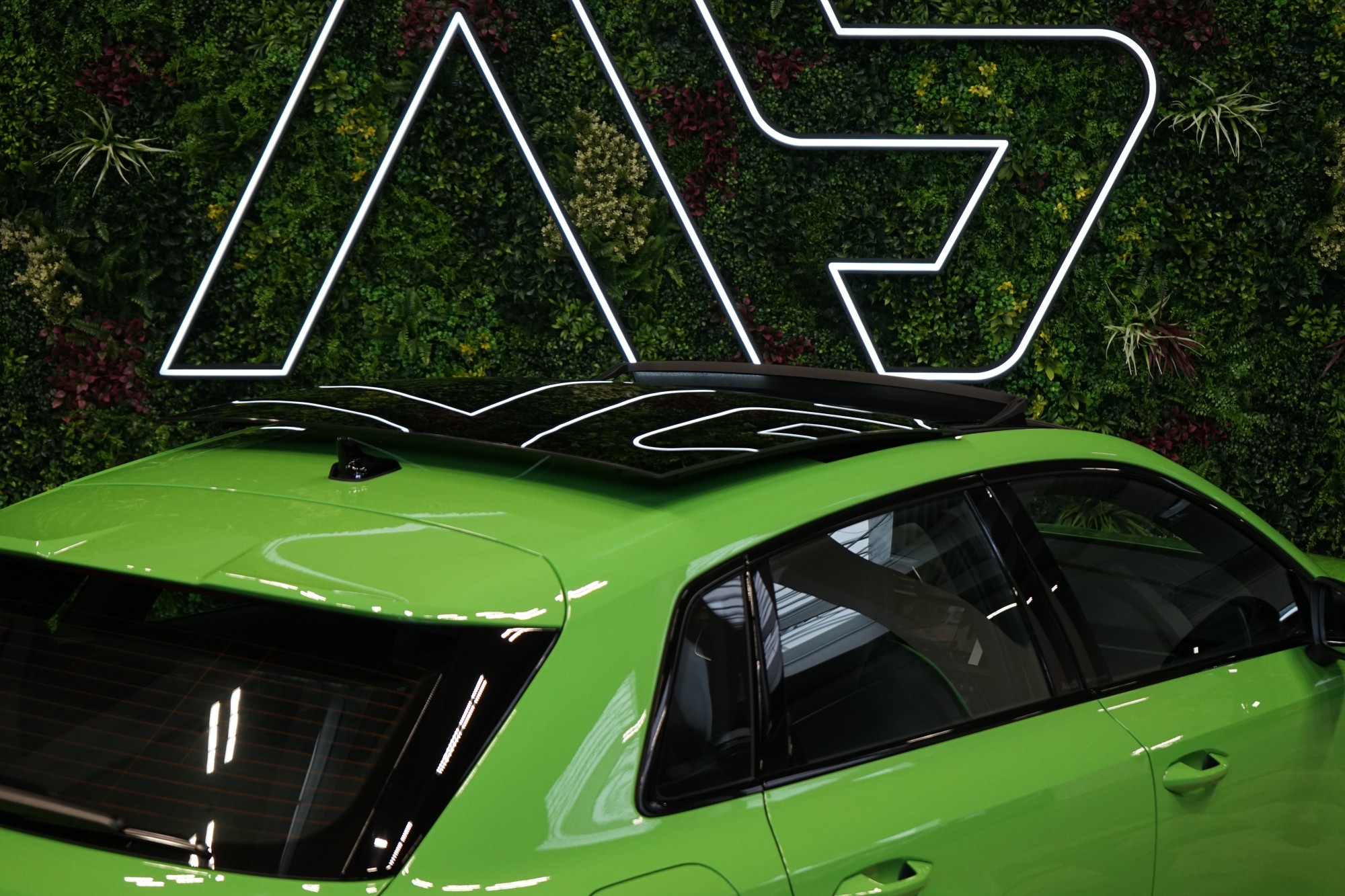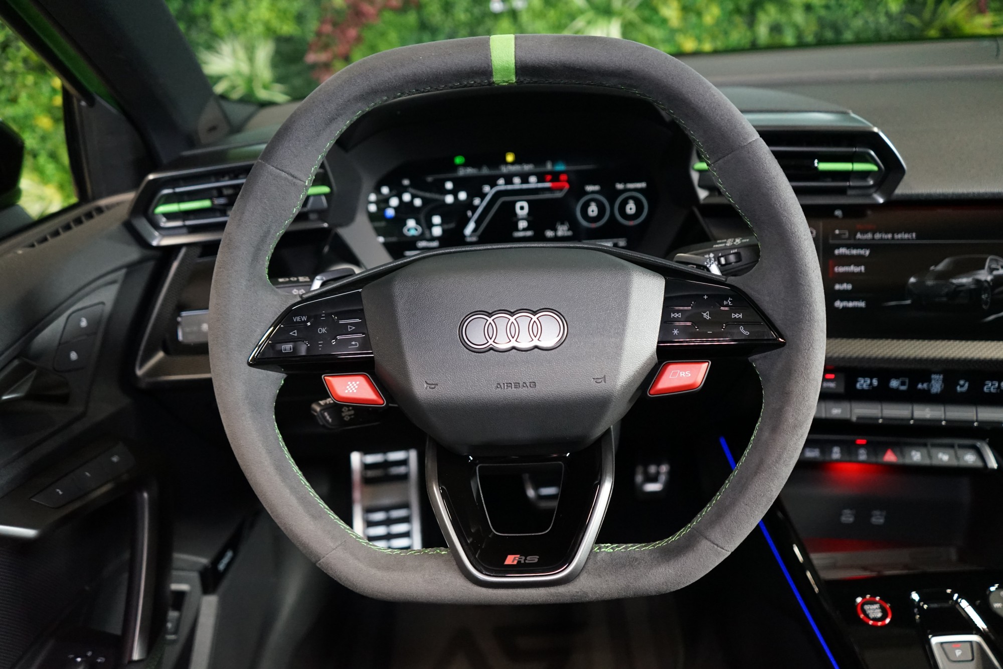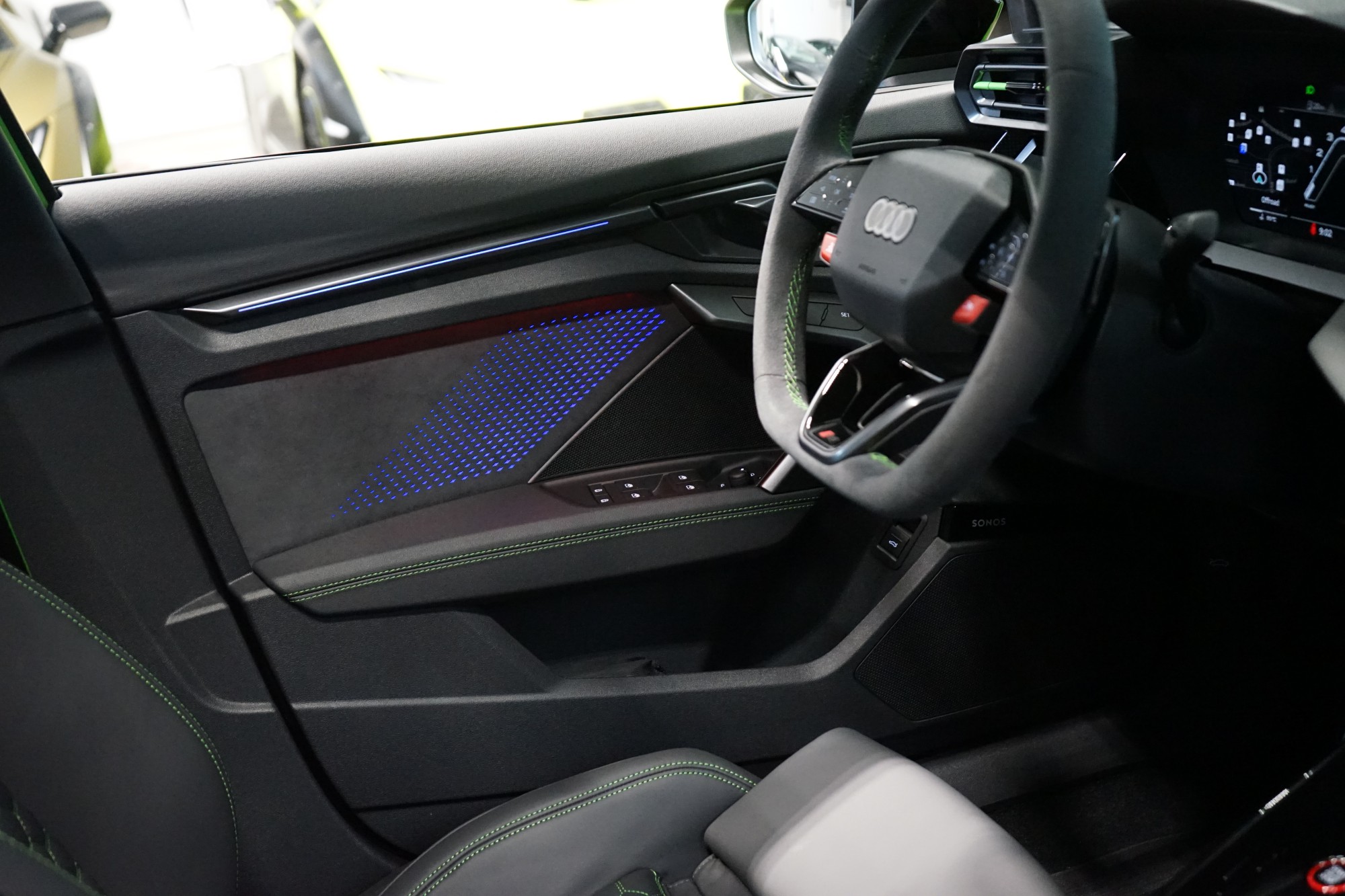 Sportovní sedadla vpředu v jemné kůži Nappa s kontrastním prošíváním v expresní zelené barvě se vzorem včelí plástve a reliéfem RS