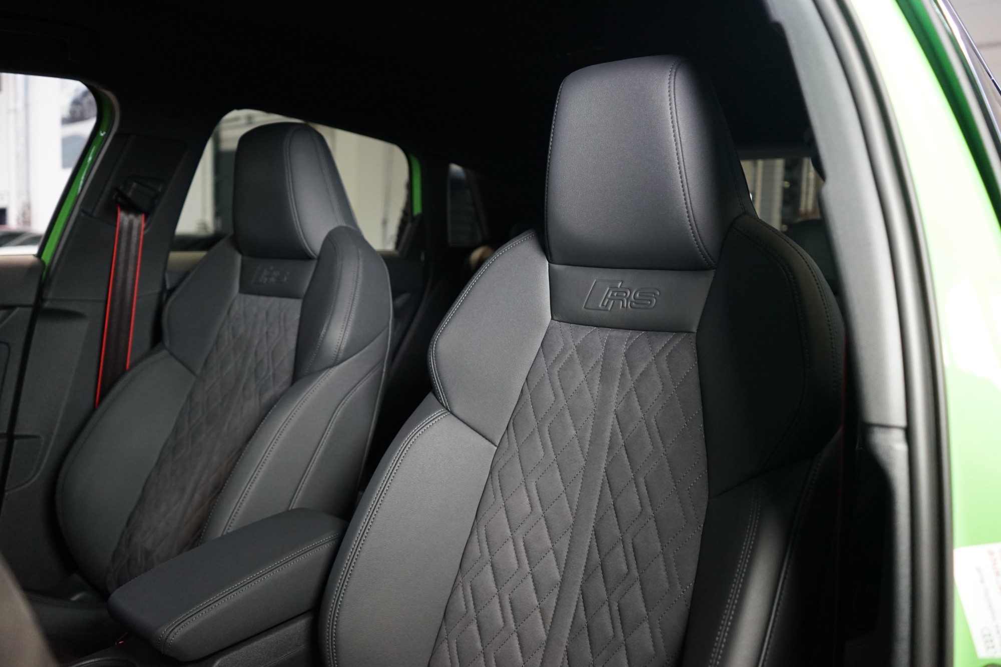 Čalounění sedadel v kombinaci umělá kůže a mikrovlákno Dinamica s kosočtvercovým vzorem a s vyraženými RS logy v sedadlech