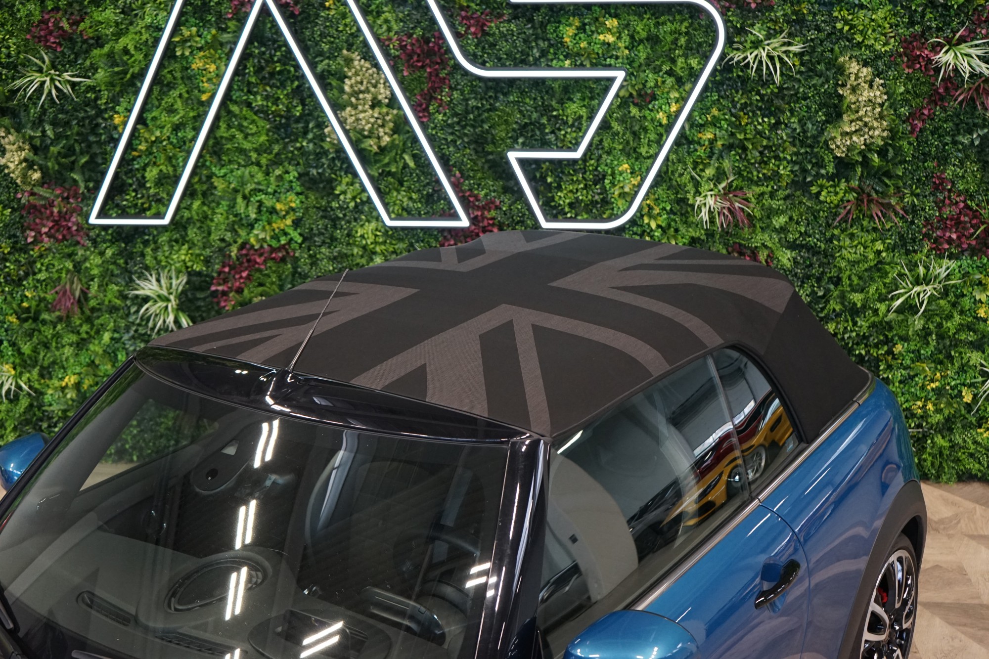 • Černá plátěná střecha Softtop MINI Yours se vzorem "Union Jack" v barvě Titanium Grey